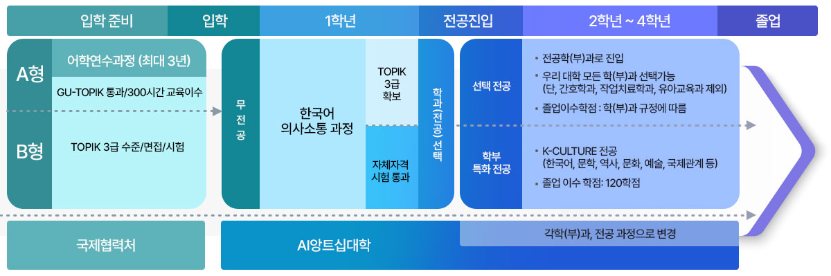 유학생 대상 기숙사, 생활 멘토링, 교수진과 1:1 진로상담 운영